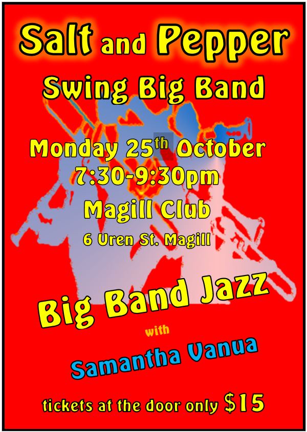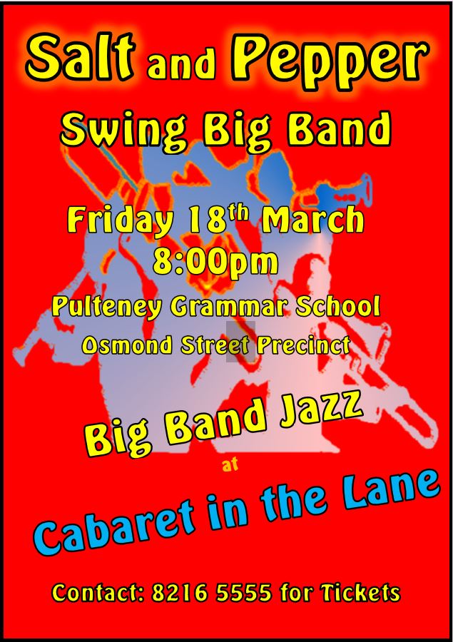 Salt and Pepper Big Band is a 17 piece big band – 5 saxes, 4 trumpets, 4 trombones, piano, bass, guitar and drums.